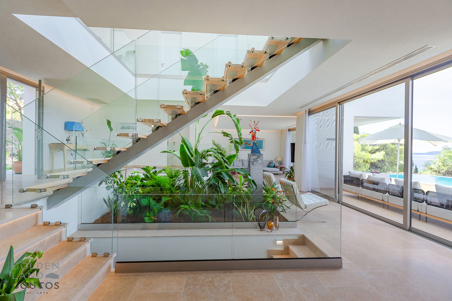 The upper floor is dedicated to rest and stunning views. A stylish lounge area enjoys uninterrupted sea views, while four spacious bedrooms, each with its own en-suite bathroom and private balcony provide peaceful retreats for family and guests.