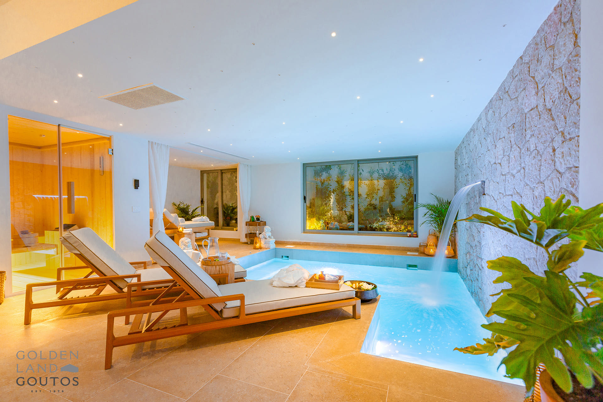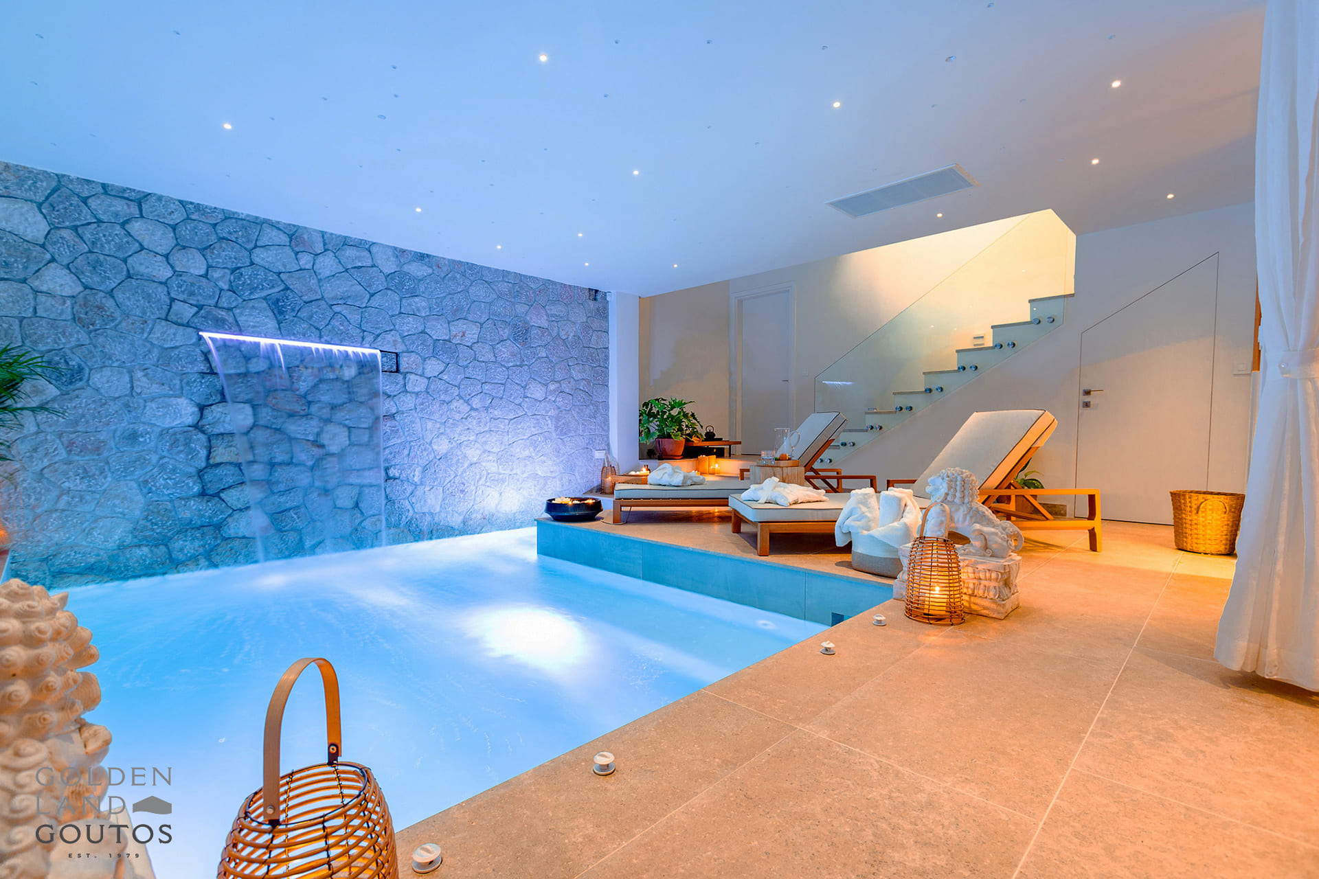 The lower level is all about wellness and leisure. Here you’ll find a gym, spa area, sauna, and bathroom. A heated indoor pool with waterfall and hydromassage offers the perfect way to unwind after a long day. There’s also a practical laundry room, enhancing the ease and functionality of daily life.