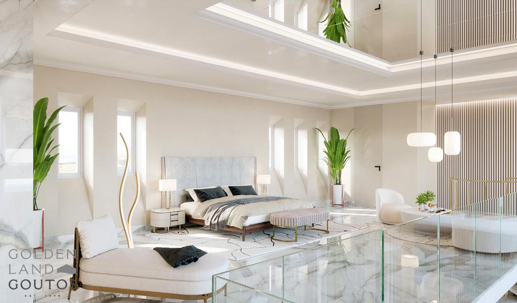 The upper floor and mezzanine level host five master bedrooms, each designed with privacy and elegance in mind. Every suite enjoys direct access to private terraces or balconies, all overlooking the Aegean Sea, reinforcing the villa’s connection to its exceptional surroundings.