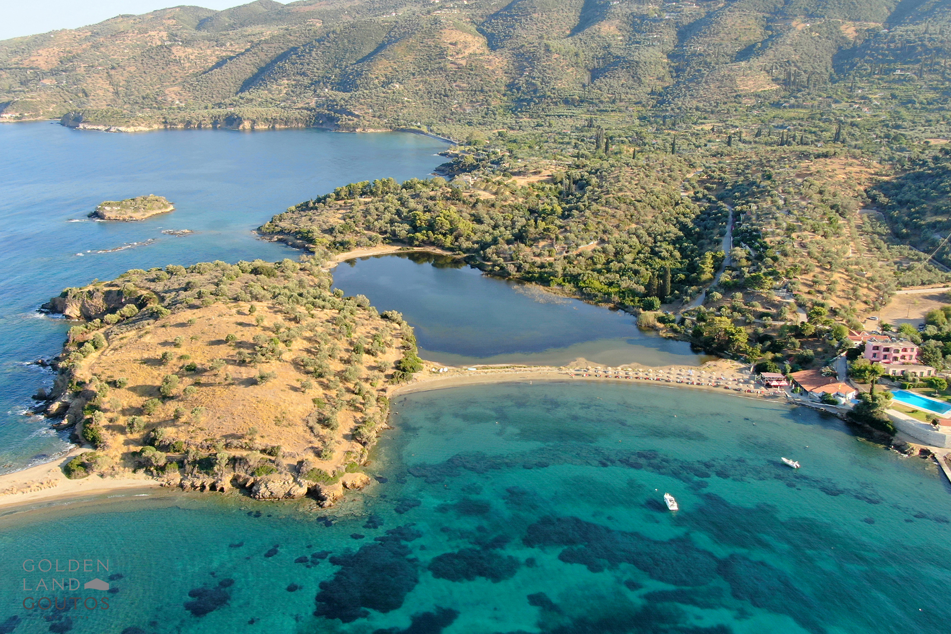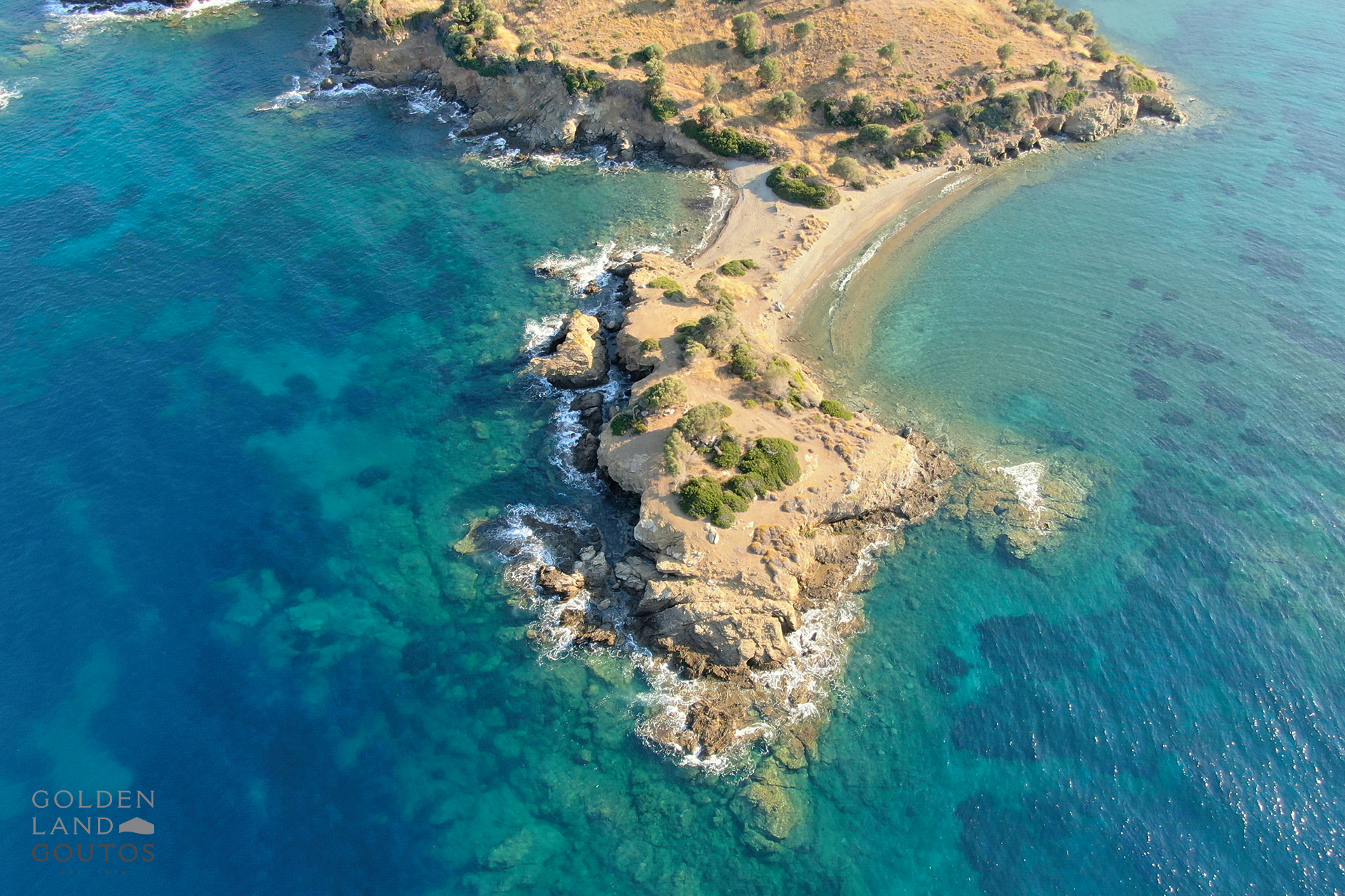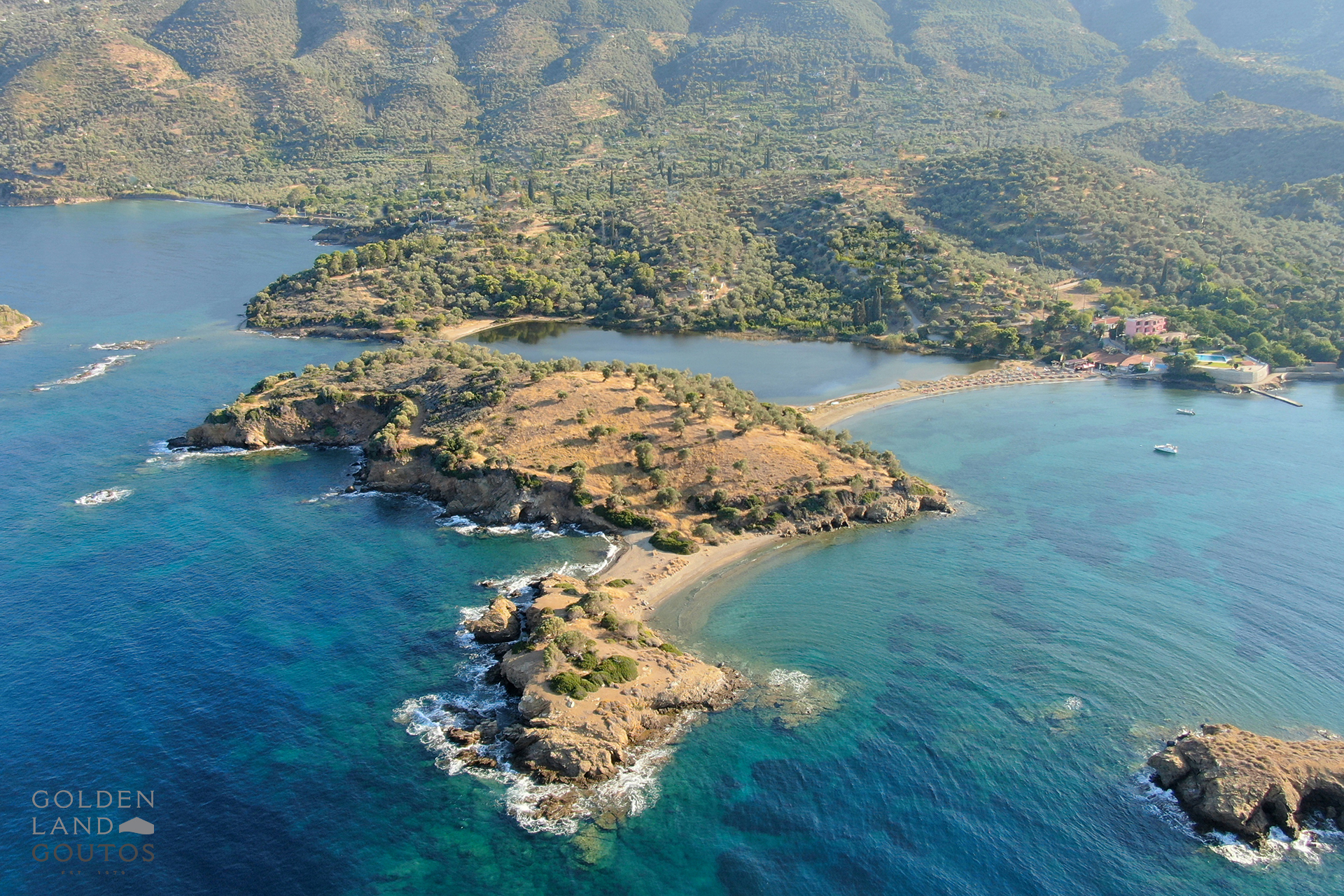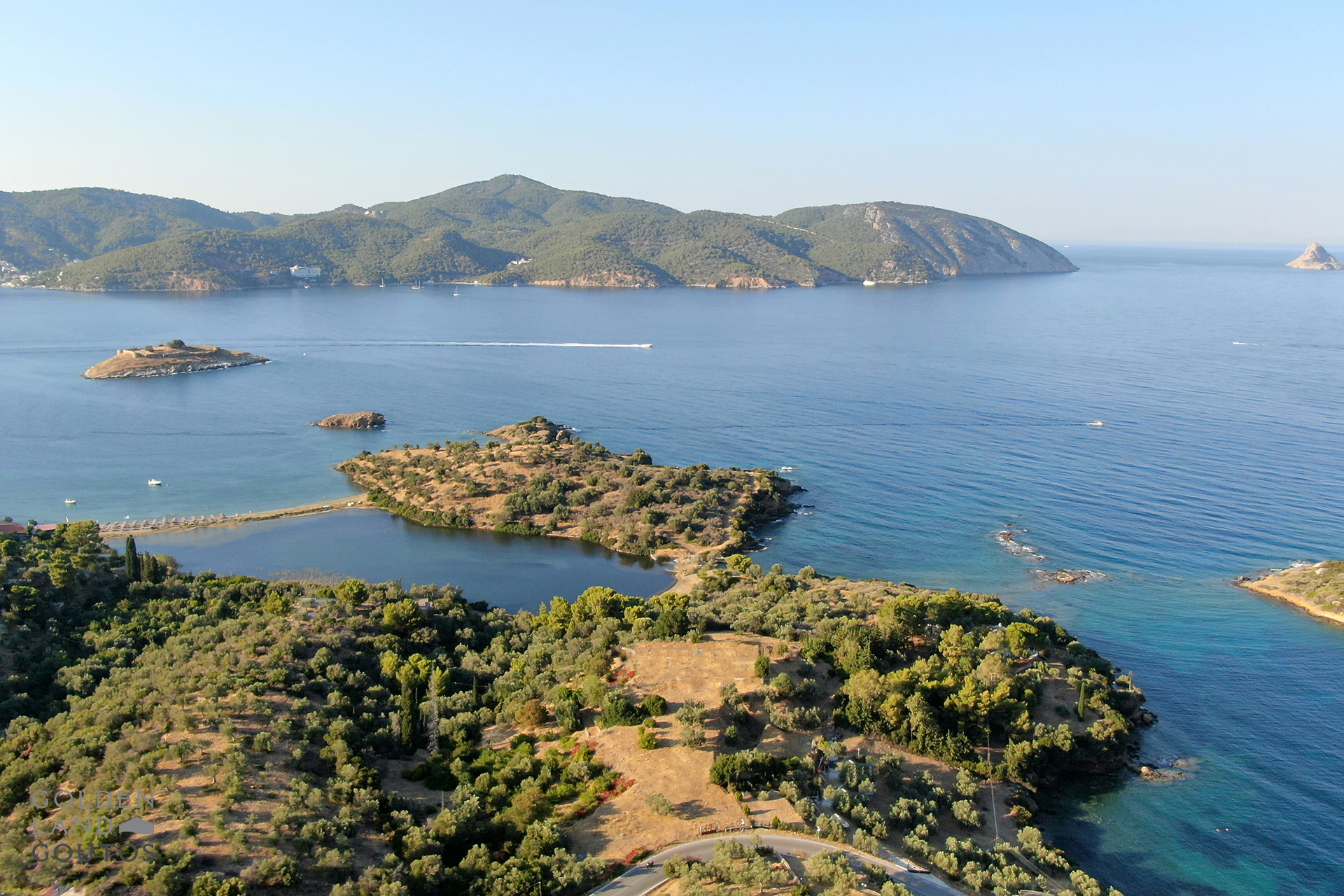 Exclusively offered by Golden Land Goutos – Island opposite poros, this fantastic estate with a surface of 70,000 sqm is located on the edge of the famous Lemon Forest of the island of Poros and offers independence to its potential owner, while giving the feeling of a private island. It is worth mentioning that this estate is not cut off from the mainland and so it is also accessible from the road. The stately hill at the center of the smal peninsula and the morphology of the ground offer spectacular views across the island of Poros, as wel as the endless blue of the Argo saronic Gulf.